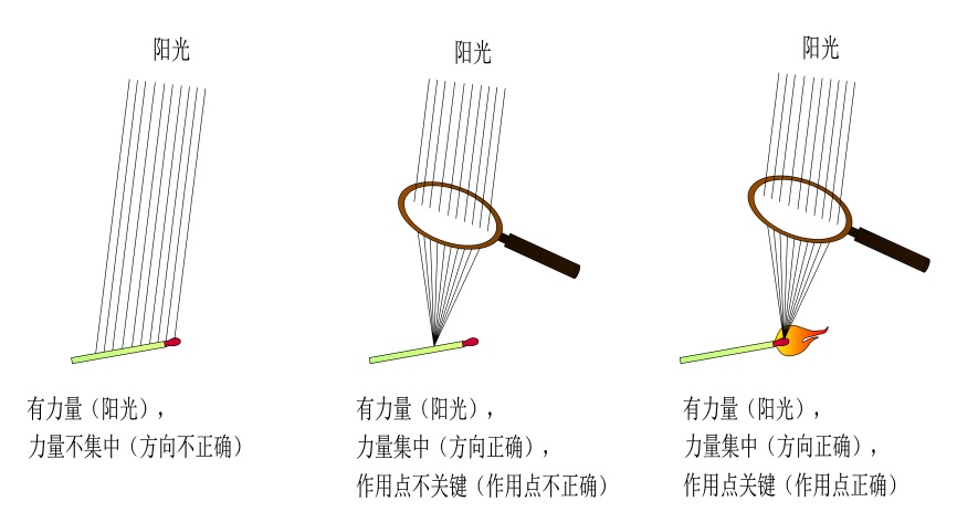 其实其他营销也可以使用物理学思维来分析,比如王老吉的“怕上火,喝王老吉。”这个广告就是从客户的角度出发的,以客户为分析对象,而不是以产品为对象,王老吉有很多特点,但是哪一个特点是满足客户需求的呢,最满足客户需求的点就是营销的关键点,从物理学的角度来说,影响成果的有4要素,分别是力的大小,方向,作用点和时间,而选择的作用点不同,则产生的成果不同,这类似于将凸透镜的焦点从火柴杆移到火柴头,力的大小没改变,但是焦点改变了,火柴就被引燃了。