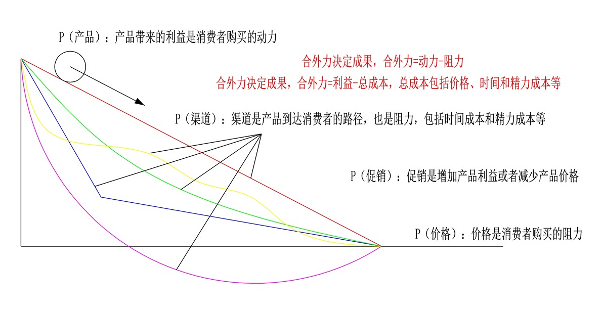 首先我们来分析一下4P,4P理论可以使用物理学中的“合外力决定成果”来分析,合外力=动力-阻力,动力越大,阻力越小,合外力越大,成果越大。产品(Product)带来的利益是消费者购买的动力,成本是消费者购买的阻力,价格(Price)是成本中的一项,而成本还包括消费者获得产品所花的时间和精力成本,也就是产品到消费者的渠道,促销(promotion)要么增加了消费者获得的利益,要么减少了消费者获得的成本,这些都可以使购买量增加,为了便于分析,我们假设促销增加了消费者利益,那么合力=(产品+促销)-(价格+渠道),增加产品带来的利益和增加促销,或者减少价格和渠道成本,都能增加消费者的购买量,这就是4P的力学解释。