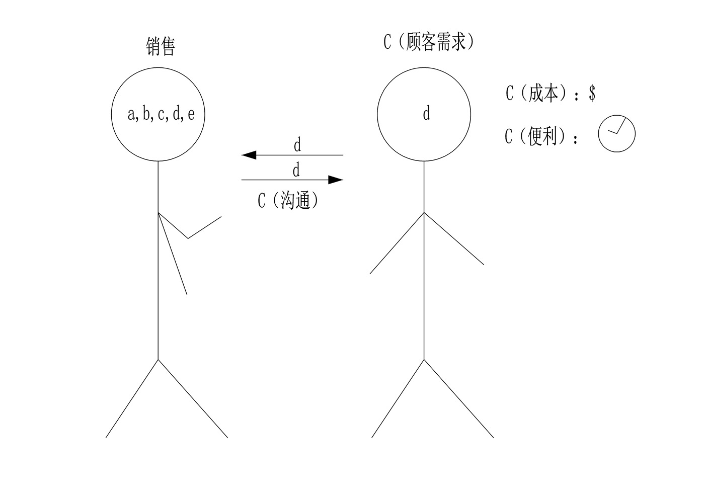 通过沟通(Communication)才能知道客户的需求,如果你的产品有a,b,c,d,e等等很多优点,但是当你不知道客户的需求时,你每一个优点都去展现,分散了自己的力量,就像乱枪大鸟一样,很难射中客户的需求。当你知道客户的需求时d优点时,你就可以集中力量来向客户展现d优点,而不是其他,这样就能射中顾客需求。越能满足客户需求(Consumer’s Needs)的产品,则客户获得的利益越大,客户购买的可能性就越大,这是客户购买的动力,而成本(Cost)是客户购买的阻力,成本包括金钱成本,时间成本和精力成本等,便利性(Convenience)就是减少客户的时间和精力成本。