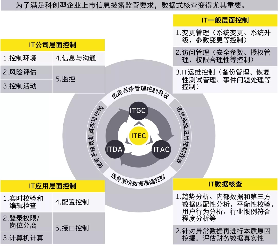 科创板成立之前,监管机构对于一些企业尤其是互联网行业的信息技术审计、运营系统和财务系统数据真实性、准确性和完整性的要求已经大大提高。信息系统核查要求主要体现在以下四个方面: