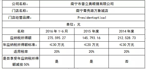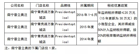 公司之全资子公司南宁市普立奥眼镜有限公司符合《中华人民共和国企业所得税法》第二十八条第一款符合条件的小型微利企业,2014 年度和 2015 年度减按20%的税率征收企业所得税。”