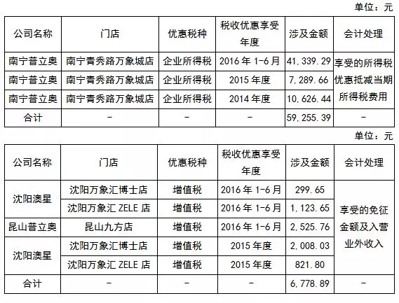 (2)鉴于发行人子公司南宁普立奥、沈阳澳星、昆山普立奥为小型微利企业,且 2015 年度、2016 年 1-6 月,沈阳澳星、昆山普立奥无应纳所得税额,根据前述法律、法规的相关规定并经本所律师核查,报告期内,仅南宁普立奥享受企业所得税优惠,具体情况如下表所列示: