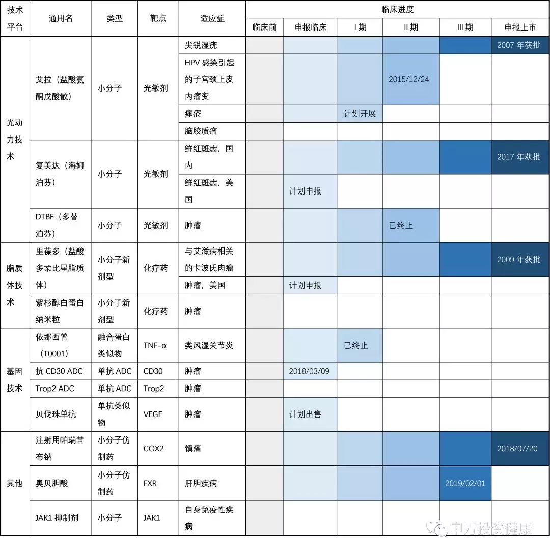 公司研发管线按技术平台可以分为三大块:光动力技术平台、脂质体技术平台、基因技术平台,其中光动力技术平台研发出的艾拉®(盐酸氨酮戊酸散)和复美达®(海姆泊芬),以及脂质体技术平台研发出的里葆多®(盐酸多柔比星脂质体)已经上市。