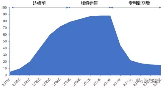 时间节点:影响DCF模型中销售额积分面积的形状(如下图所示),可以分解为达峰时间、专利到期时间。