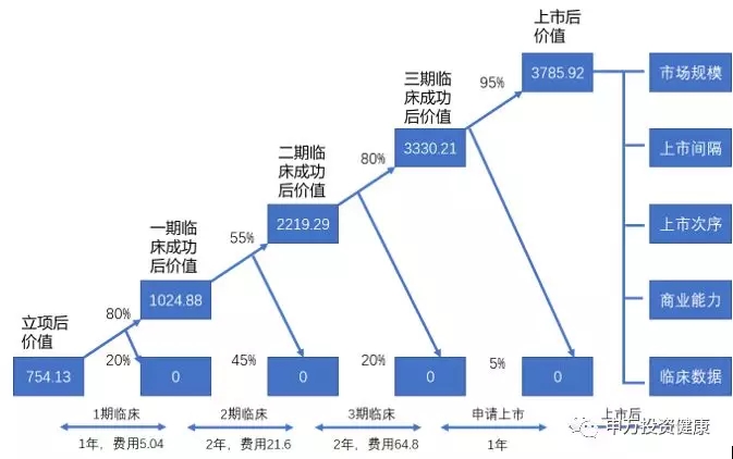 创新药的专业投资者,基于对药物机理的理解,并且参考历史上同类药物失败概率,会建立对各期临床试验成功率的相应预期,构建出二叉树定价模型(见下图),并将成功上市后NPV代入该模型中,可以倒推出临床试验各阶段的创新药价值。