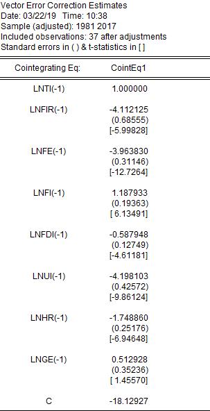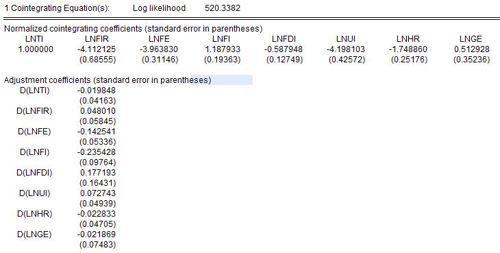 1.协整方程可以写成LnTI=4.1121LnFIR+3.96LnFE-1.1879LnFI+0.5879LnFDI+4.1981LnUI+1.7488LnHR-0.5129LnGE+18.1292吗?这个方程是否和普通回归方程的意义差不多?解释是否和普通回归方程一样?