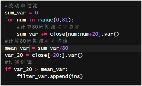 80-20 方法,即计算 80 日到当前每一日的 20 日波动率,求平均,然后用当前 20 日波动率和这个平均值做对比,如果当前 20 日波动率更大,就认为该品种目前波动率过大趋势不明,该品种就不参与交易。