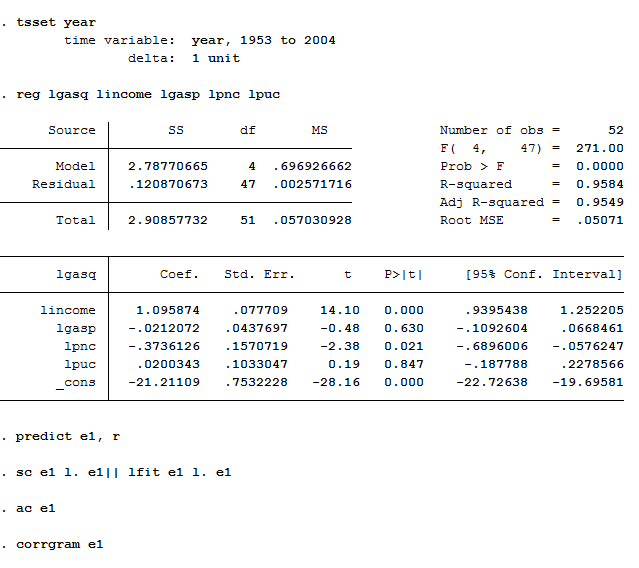 计量经济学小白一个,刚刚开始学陈强的那本《计量经济学与stata应用》。第163页那道关于美国1953-2004年汽油需求函数的题难倒我了。