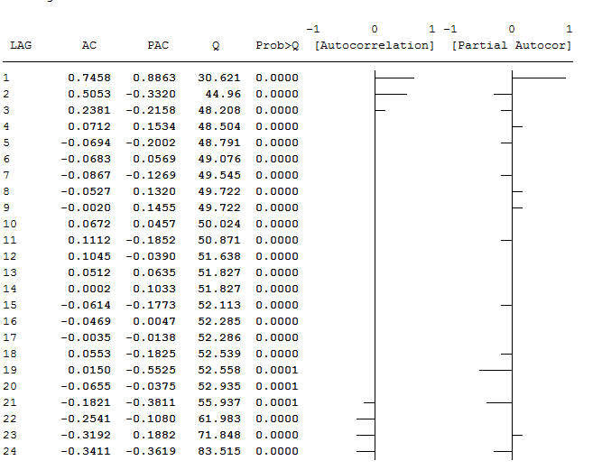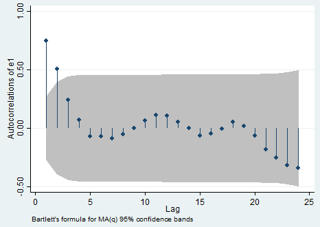 可是根据ac命令生成的自相关图显示似乎只有1阶与2阶存在自相关,而corrgram命令则告诉我似乎各阶都有自相关。问题是出在哪里呢?