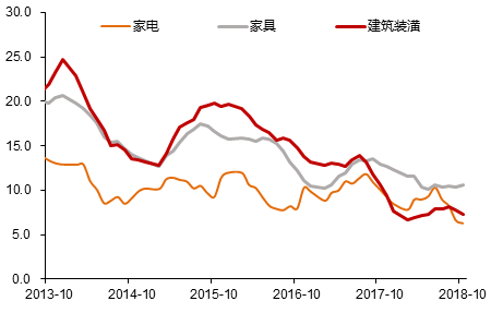为何房价上涨会带动消费增速上升呢?我们可以从三个方面去观察,一是房价上涨会带动商品房销售面积增速加快,使得与商品房相关的商品销售额增速上升,如家电、家具和建筑装潢。2016-17年商品房销售额的增速显著上升,同时,家电和家具的销售额增速均比2015年要高,且维持在10%以上。到了2018年,由于房价出现了地区间涨跌分化,销售额小幅增长,也使得家电、家具和建筑装潢等消费额增速回落。