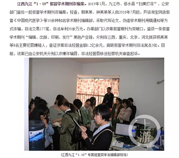 当时公布的案情是:2017年1月,九江市、修水县“扫黄打非”、公安部门查处一起假冒学术期刊诈骗案。经查,郭某某、钟某某等人自2016年7月起,开设淘宝网店假冒《中国现代医学》等10余种知名学术期刊编辑部,采取代写论文、伪造学术期刊用稿通知等方式诈骗,非法交易177笔、非法牟利30余万元。