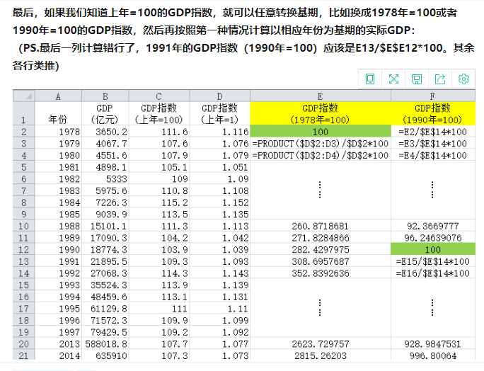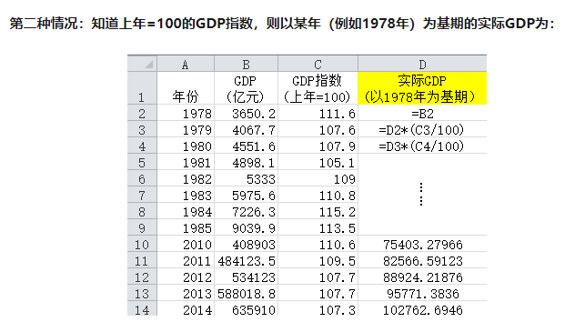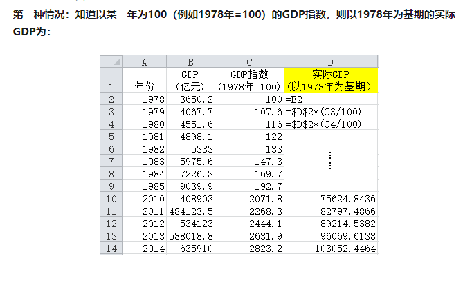 如果以2003年为基期的话,CPI的平减首先是将2003年的CPI指数看作100,然后将2003-2016年每一年的CPI指数(这里是环比指数)除以100,然后每一年的CPI指数(基期指数)就等于从基期开始到该年环比指数的乘积,然后再用每年的数据(如居民收入水平)去除以计算出来的每一年的环比指数就可以了(根据CPI的计算公式可以明白为什么要用除)。图片是关于计算不变价GDP的,忘记从哪里下载来的了,分享给大家吧。