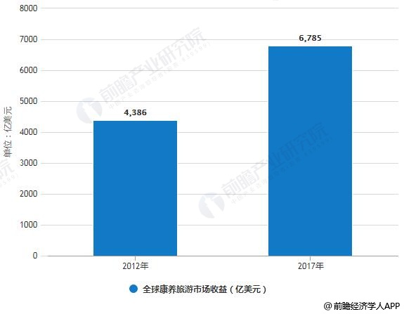 近年来,随着人们对健康生活的重视,“大健康”产业正快速迈入新一轮的增长。作为把旅游业和“大健康”产业结合的康养旅游,拥有着良好的市场环境,是发展空间巨大的蓝海市场。数据显示,目前世界上有超过100个国家和地区开展康养旅游。2017年全球康养旅游市场预计收益约达6785亿美元,相比2012年的4386亿美元的市场收益足足增加了将近2400亿美元,复合增长率达9.12%。
