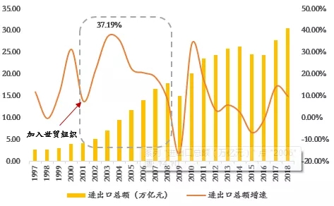 从增速上来说,中国进入世贸组织之后,进出口总额平均增速高达14.55%,同期GDP增速为13.31%,贸易增速高于同期GDP增速。