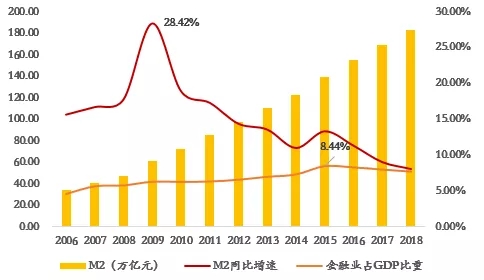 2008年,我们的M2还不足50万亿,现在已经超过180万亿,货币增长带来了金融泡沫的繁荣。2016年,我国金融业占GDP的比例一度达到8.4%,远远超过了美国日本等发达国家,显然是过度的繁荣。