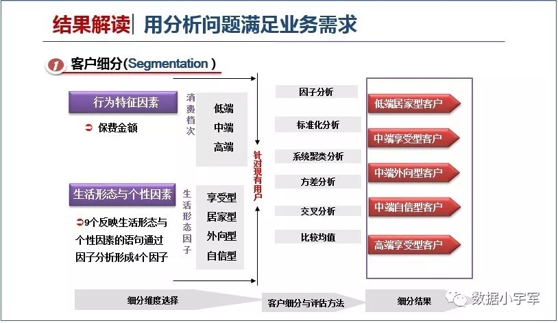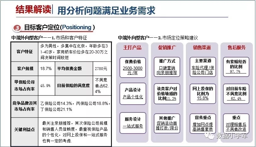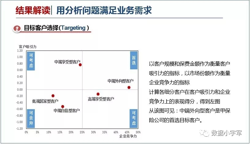 上述分析结果实现了甲保险公司的研究目的,即回答了客户细分、目标客户选择和目标客户定位三个问题。