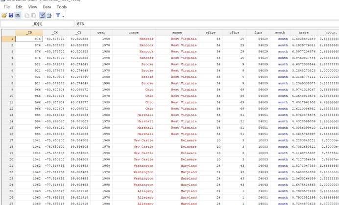总之,打开那个 犯罪率1960——1990.dta 是下面这个样子(如果你要学pdf的案例的话)(有时候直接点开那个dta文件,是另外一个错码的样子——你要把dta文件放到stata根目录下,然后用 use homicide_1960_1990 的命令打开。)