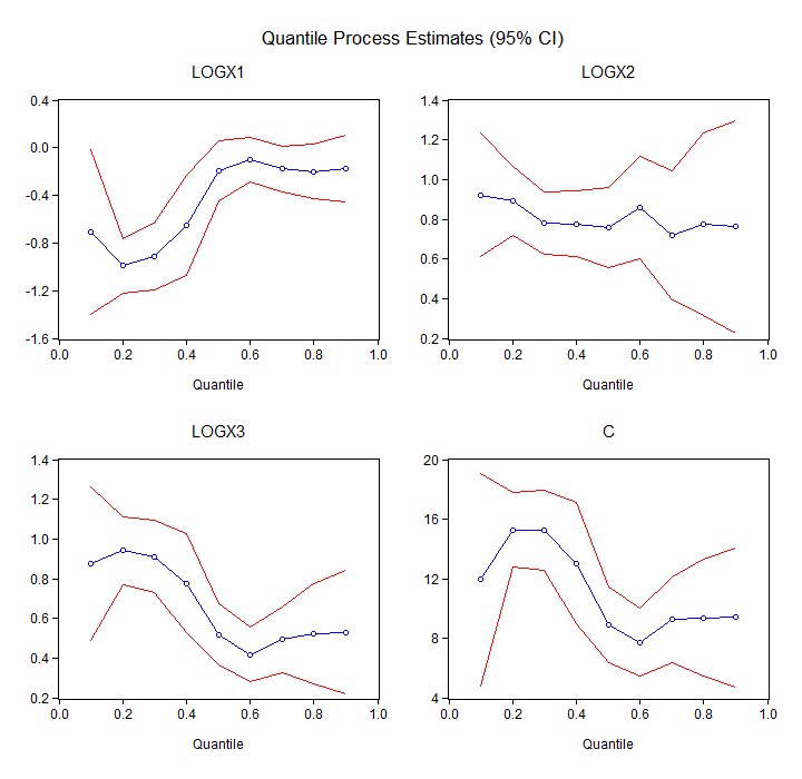 用EViews做分位数回归,获取分位数回归的系数时,选择Graph,得到了如下的系数图