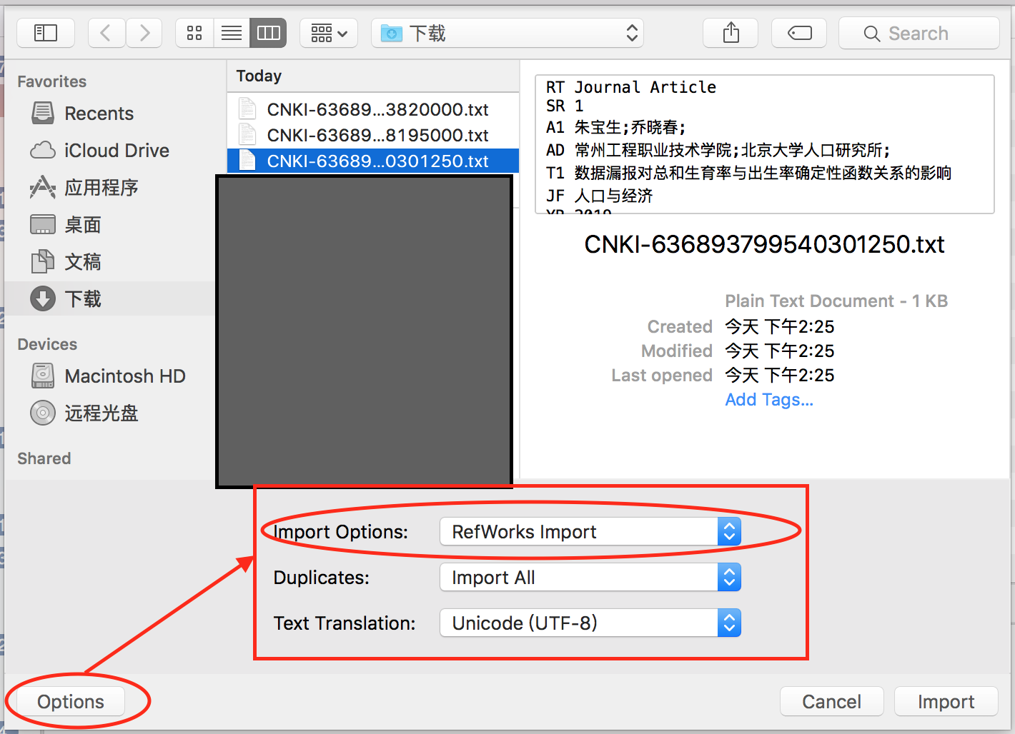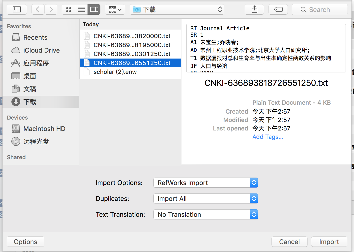 在 windows上使用endnote管理文献,换Mac后出于习惯也安装了Mac版的endnote,但是最近发现一个问题,那就是在 Mac中导入CNKI文献十分费劲。由于CNKI的引文是txt格式,在Mac中import时没有反应,这让我很崩溃,一度想摔电脑。后来一顿百度,发现度娘并不能满足我,后来直接谷歌,问题完美解决。网上好多人问最后都不了了之,因此我觉得有必要把解决方法发上来。