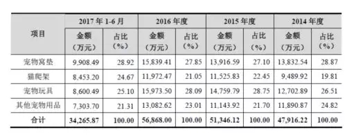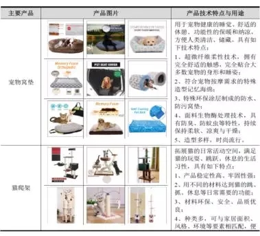 公司主营业务为宠物用品的设计研发、生产和销售。公司的主要产品包括宠物窝垫、猫爬架、宠物玩具,以及宠物服饰、宠物牵引绳、宠物刷子、宠物餐具、宠物垃圾袋、猫厕盆、电子化智能宠物用品等其他宠物用品,为客户提供了多个产品系列,几千种规格型号的宠物产品,形成了较为完整的产品体系。公司产品主要出口到美国、德国、澳大利亚、日本、瑞典、英国、法国等几十个国家和地区,主要客户为境外知名的大型连锁零售商、专业宠物用品连锁店以及宠物用品网上销售平台。目前,公司已获得美国沃尔玛、Kmart AUS、港南商社、TRS、KIK 等大型连锁超市、大卖场,Petco、Fressnapf 等大型宠物用品连锁店等的认可。