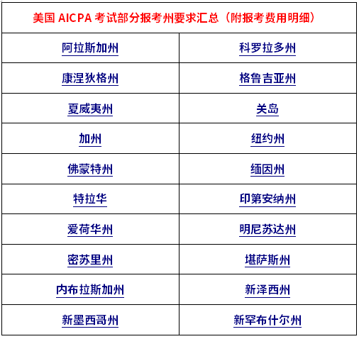 具体各州AICPA报考要求可链接NASBA官网查看各州要求,也可以复制链接http://aicpa.lixinedu.com.cn/enroll/4610.html查看部分州报考要求。