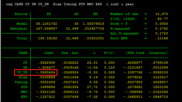问题1:CF_YN、CF_Anlyst系数为负,CF_YN_Anlyst系数为正,该作何解释,YN与Anlyst是存在替代效应还是其他?