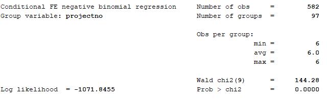 烦请各位坛友帮忙查看,我在进行固定效应回归时有618个观测值,103组,为什么同样的回归在固定效应负二项回归当中观测值和组的数量减少了?有些什么可能的因素会让FENB模型去掉样本呢?谢谢各位!
