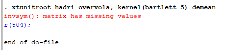 各位老师同学好,我的面板数据是n=194,T=589的平稳数据(我检查了数据,没有缺失值),变量是波动率,数值比较小,很多数据都是0.01的量级。在STATA15.0中做平稳性检验时,出现如下3类的Error提示: 第1类:LLC检验、IPS检验:matrix not positive definite 第2类:Fisher检验:could not compute test for panel ,最后结果看起来也有问题 第3类:Hadri检验:invsym(): matrix has missing values