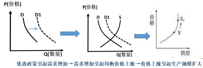 “新能源汽车购置优惠政策影响”结果是:需求曲线右移及在原价格不变时供给量增加。