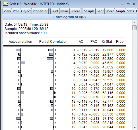 - eviews操作,用GARCH类模型拟合市场波动性时,采用十几年的收盘价月度数据P,并取其对数收益率R=dlog(P)。操作过程中,检验得到R序列平稳,但是序列存在自相关(view-correlogram),请教各位大神这是几阶相关,还有如何解决此自相关问题,才能够进行之后步骤。(给出R的自相关和偏自相关图、和R一阶差分后的自相关和偏自相关图)十分感谢!!!!!!