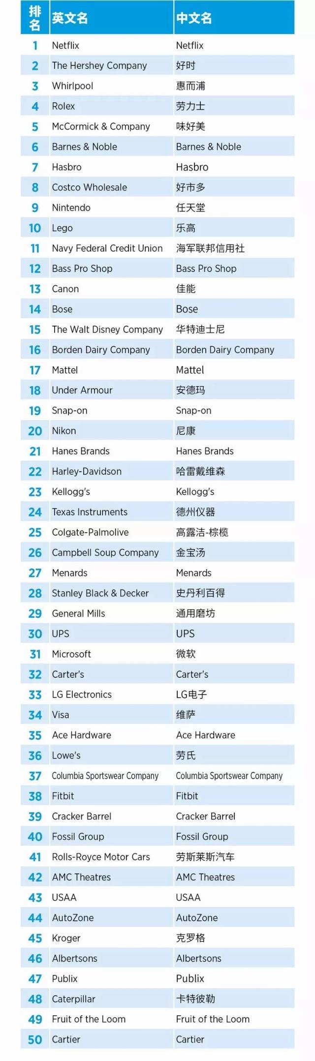 在美国声誉最佳公司TOP50