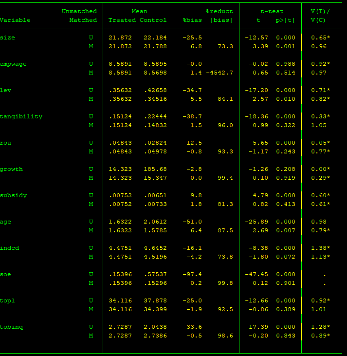 以上是倾向得分匹配后,检验控制组与处理组平衡检验结果,这些指标怎么看呢? 求助个位大神