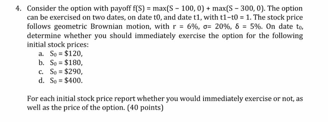 根据所给的strike,很容易可以算出如果立即行权所得到的payoff。如果不立即行权,也就是一年以后行权,再把每个strike情况下的option价格算出来(套用BSM公式,这个option就相当于两个vanilla European call options expiring in one year)。最后每个strike的情况下,对比立即行权的payoff高 还是option的价格高,来决定是否立即行权。