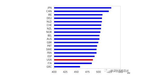 从最受尊敬的PISA(国际学生评估项目)测试分数来看,美国目前在发达国家中排名倒数15个百分点左右。如下图所示,除意大利和希腊外,美国的得分几乎低于所有发达国家。这阻碍了许多人拥有足够的生活水平和美国的竞争力。