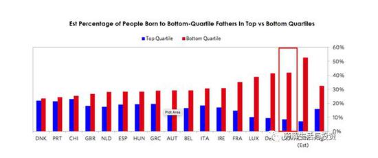 尽管大多数美国人认为美国是一个拥有巨大经济流动性和机遇的国家,但美国的经济流动性目前是发达国家中最差的之一。如下图所示,在美国,父亲处于收入最低的四分之一的人有40%的机会保持在那个四分之一,只有8%的机会进入最高四分之一,这是上升平均概率的一半,也是被分析的国家中最糟糕的概率之一。在一个机会均等的国家,这是不可能存在的。