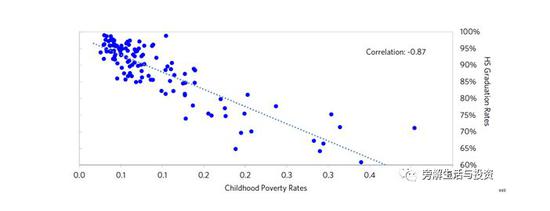 将康涅狄格州学区的高中毕业率与儿童贫困率进行比较,可以发现整个州的高中毕业率之间存在紧密的关系:儿童贫困率每高出1%,毕业率就会降低1%左右。
