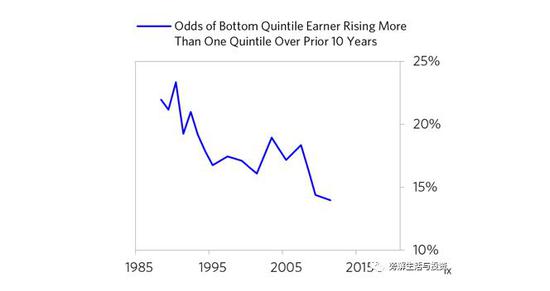 他们越来越陷入贫困。下面的图表显示了一个人在10年内从收入最低的五分位数上升到收入最高的五分位数的几率。这种可能性从1990年的23%左右下降到2011年的14%。
