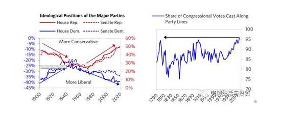 我们现在看到,左翼民粹主义者和右翼民粹主义者之间的冲突在全球范围内不断加剧,其方式与上世纪30年代的情况大致相同,当时的收入和财富差距相当大。在美国,意识形态的两极分化比以往任何时候都要严重,妥协的意愿比以往任何时候都要低。左边的图表显示了保守的共和党参议员和众议员的情况,以及民主党参议员和众议员的情况,可以追溯到1900年。正如你所看到的,他们每一个人都比以前更加极端,也更加分裂。右边的图表显示了自1790年以来他们中有多少人是按照党派路线投票的,这是有史以来的最高比例。换句话说,它们有更多的极性极端位置,而且它们在这些位置上比以往任何时候都更加稳固。我们即将进入总统选举年。我们可以期待一场地狱般的战斗。