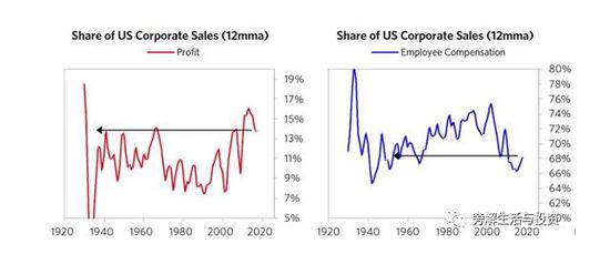 由于这两种力量的作用,收入中转化为利润的份额相对于工人的份额有所增加。下面的图表显示了自1929年以来公司收入中利润所占的百分比和员工薪酬所占的百分比。