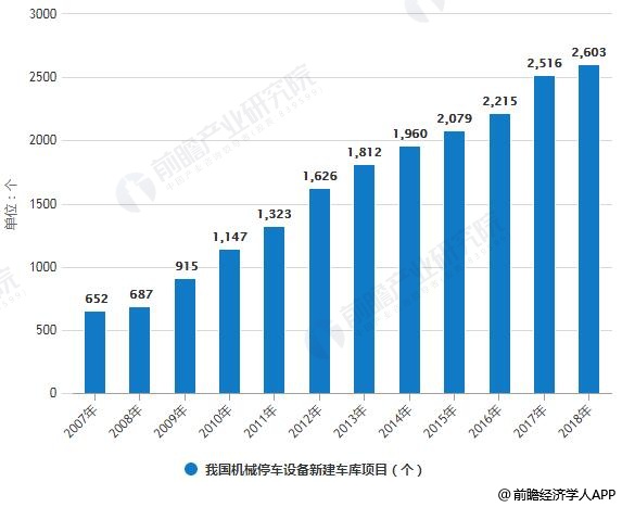 2007-2018年我国机械停车设备新建车库项目及泊位数量统计情况