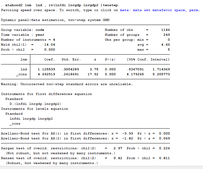 计量小白一只,我做系统GMM的原因是为了做稳健性检验,基础回归是做的固定效应,城市5年的面板数据,检验d对m的影响。加了fdi和人均gdp以及人均gdp的平方作为控制变量。我查阅的资料说iv后面放严格外生变量,模仿别人写的命令是: