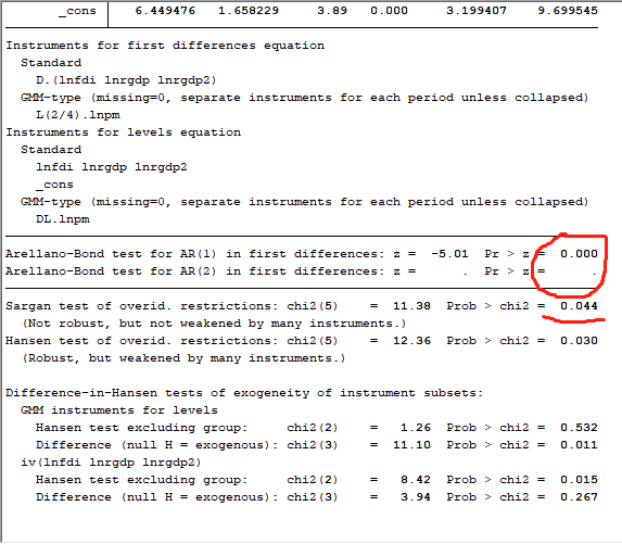 回归结果如下图。我看文章说AR(2)大于0.05不显著才是通过的。我的AR(1)显著,AR(2)不显著。Sargan和Hansen都不显著,但是一个Not robust,一个robust。我看陈强的书上例子也是这样的,是不是意味着我这个稳健性通过了?