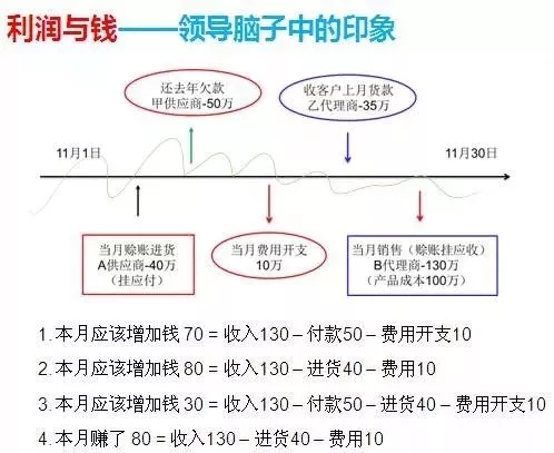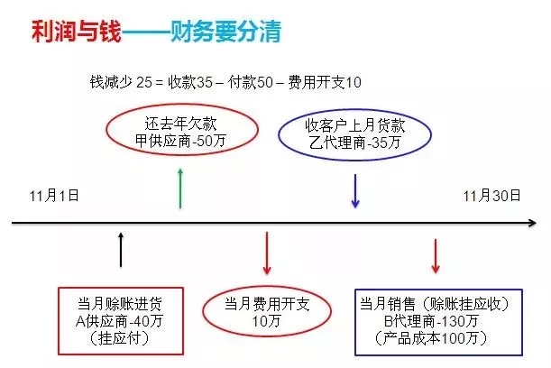 利润是损益表上面的数字,是财务意义上的概念,而钱是现金流量表上的数,民营企业的老总一般没有财务报表,也就是平时所说的账的概念,因此会混淆利润和钱的概念,正如上图所示,这个月一共5笔进账,当月赊账进货A供应商40万,还去年欠款50万,当月费用开支10万,收到客户上月货款乙代理商35万,当月销售(赊账挂应收)B代理商130万(产品成本100万)。分析这几笔数据,从财务的角度来看利润=20=收入130-成本100-费用10,而钱=25=收款35-负款50-费用开支10。显然,钱减少了但是利润是增加,可以说是没有关联的。