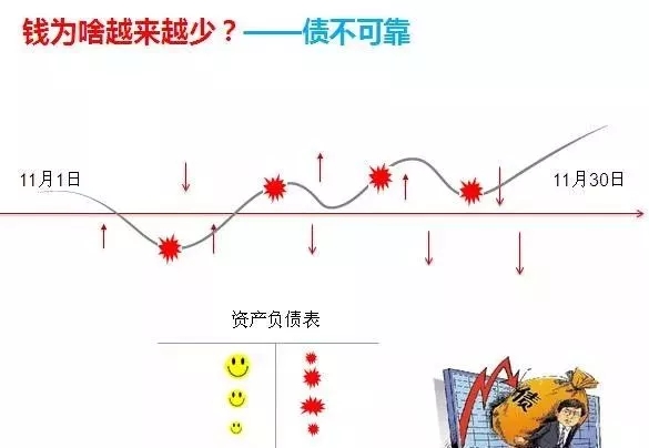 第三个原因就是债不可靠,资产负债表的左边是各种资产清单,可以看出各种经营资产的分布、比例、经营的特点、管理能力、企业排名等等,右边则是各种资金来源,负债和所有者权益,债权人有银行、政府、供应商、员工等,其次还有股东投入的资金,从数学上说,资产=负债+所有者权益,这一公式是永续平衡的,但是并不会永续平衡,是一个动态发展的过程,周转中的资金有可能突然没有了,债权人既是金主,又是定时炸弹,因此企业就存在者有钱不敢花,缺钱的状态。债的存在,总让我们觉得资金不安全、不可靠,因此在经营管理中,要提高企业资金的规划和预测性,以及对资金处理的严肃性。