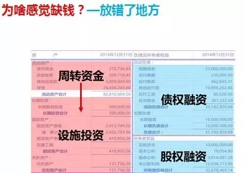 其次就是钱放错了地方,公司的钱不能乱放,比如库存多少、银行多少、周转资金多少、生产线多少、研发多少是有一定比例的,不可以随意放置。公司的每笔钱都是有他的去向的,所以这种情况下,放错了地方,结构尚不合理,势必总感觉缺钱,最有效的办法是,将企业资产负债表各个科目打上框,对资产进行分类,哪些是运营的、哪些是周转的,一目了然。