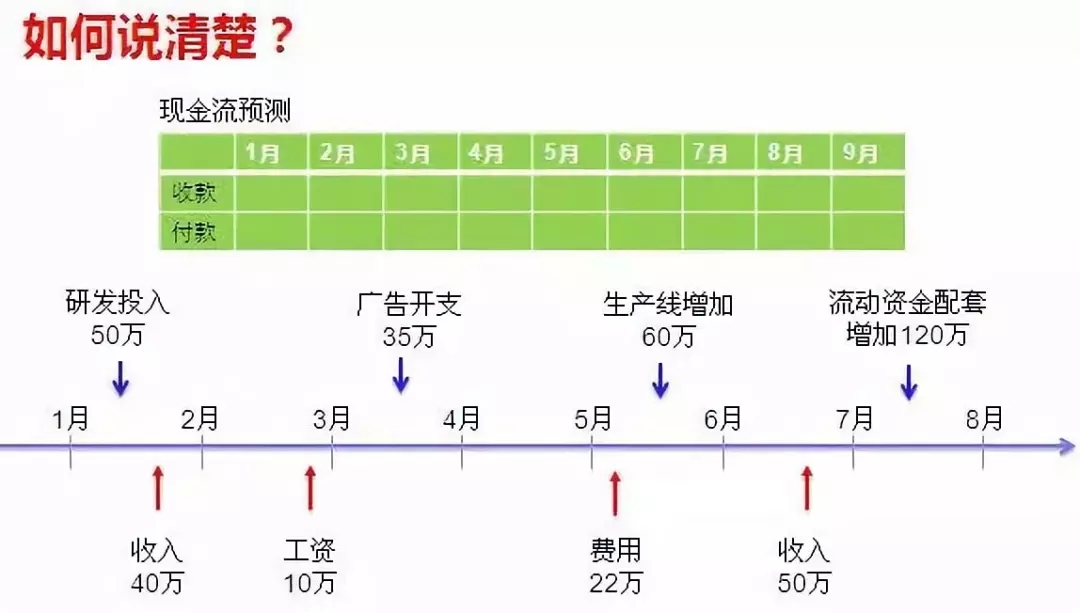 要想老总说明白资金流,钱如何花出去,必须要画一个时间数轴,只用嘴说是说不明白的,要把各种收入和指出画在坐标上、一目了然,如下图所示: