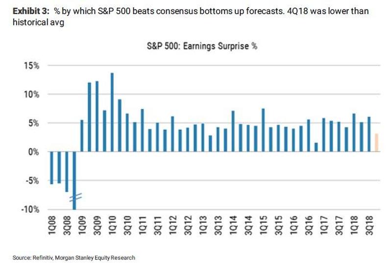 研报还提醒,美国企业的盈利结果通常比预期高4%-6%;2018年四季度企业盈利只比预期高3%,低于过往的平均水平。展望2019年一季报,盈利预期已经大幅下调,即便如此也并不意味着出现最终结果大幅高于预期的情况。