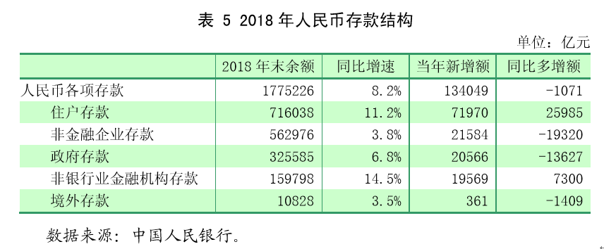 另据中国人民银行《2018年第四季度中国货币政策执行报告》显示,2018年末,金融机构本外币各项存款余额为182.5万亿元,同比增长7.8%,增速比上年末低1.0 个百分点,比年初增加13.2万亿元,同比少增5040亿元。人民币各项存款余额为177.5万亿元,同比增长8.2%,增速比上年末低0.8个百分点,比年初增加13.4万亿元,同比少增1071亿元。