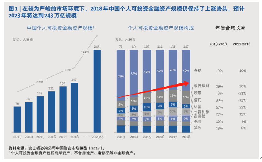 4月8日,中国建设银行携手波士顿咨询公司(BCG)发布的《中国私人银行2019:守正创新 匠心致远》(下文简称报告)显示,2018年,中国个人可投资资产构成中,银行存款占49%,这一比例在2017年为48%。