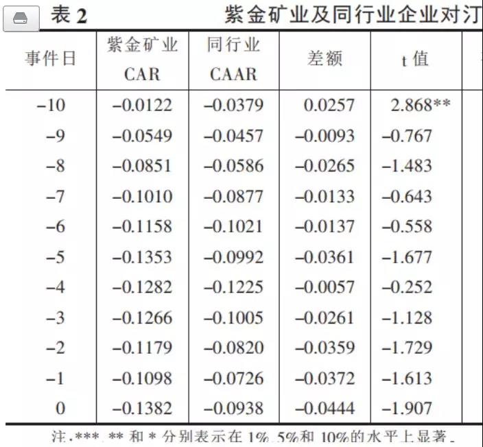 论文原文中没有说明计算方法。根据论文提供的有限信息推断如下。紫金矿业CAR每个时间点只有一个数值。拿来做对比的同行业股票是6家,CAAR指的是6家CAR的平均值。表中检验的实际上是6家CAR的平均值与紫金矿业的CAR有无显著差异。以事件日0为例,表2检验了同行业CAR的均值是否等于-0.1382。因为同行业CAR样本只有6个点,所以是小样本检验;在一系列假设下,检验统计量服从自由度是5的t分布,查表可判断显著程度。另一种等价的方法是:同行业6个CAR数值均减去紫金矿业CAR数值,然后只对常数项回归——回归中常数项估计量对应的t值就是表2报告的t值。